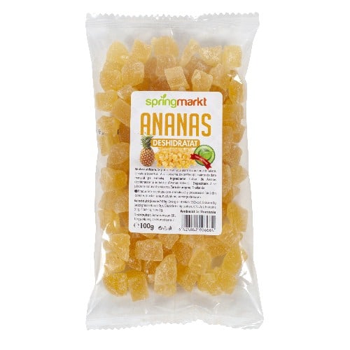 Ingrediente: Cuburi de ananas deshidratate si indulcite (Ananas Sativus).