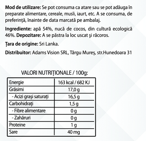 Ingrediente: 54% apa, 46% nuca de cocos din cultura ecologica.