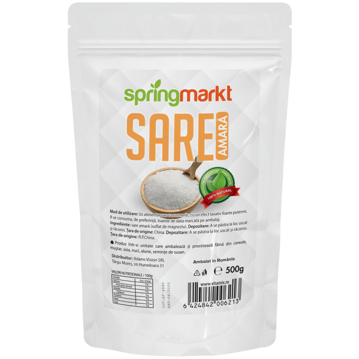 Sarea Amară de la Springmarkt este un produs natural, 100% pur, ambalat cu grijă intr-un pachet resigilabil de 500 g. Acest tip de sare, cunoscută și sub denumirea de sare Epsom sau sare de magneziu, este recomandată atât pentru uz cosmetic, cât și pentru intreținerea corpului și a grădinii. Granulele fine se dizolvă rapid in apă, eliberând ioni de magneziu și sulfați, care ajută la relaxarea mușchilor, ameliorarea durerilor articulare și detoxifierea organismului. Datorită proprietăților sale remineralizante, sarea amară este un aliat de nădejde in ritualurile de ingrijire a pielii, conferind un efect calmant și reparator.